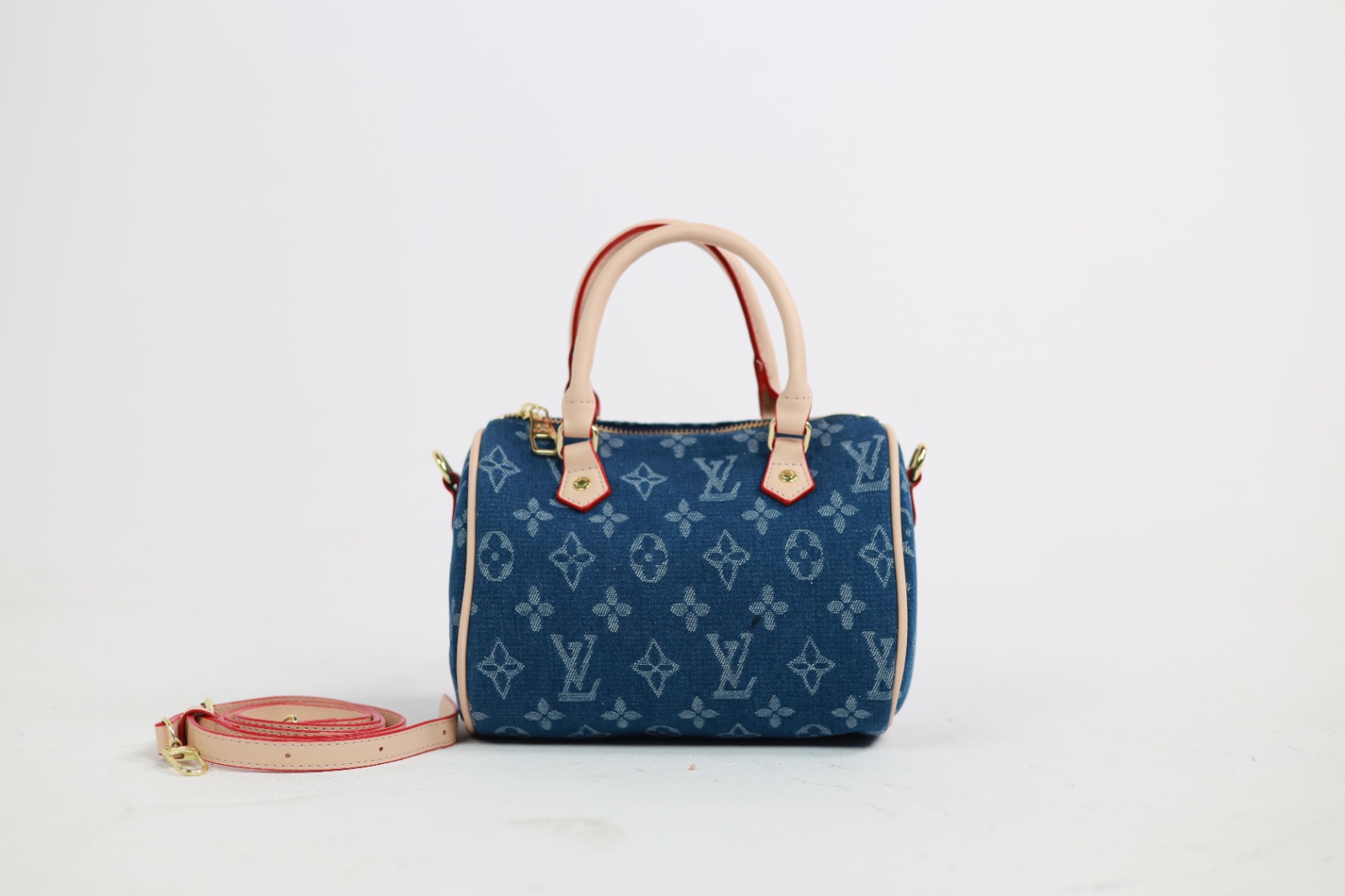 Ce mini sac Speedy de Louis Vuitton est en toile denim bleue avec des détails en cuir naturel et métal doré.