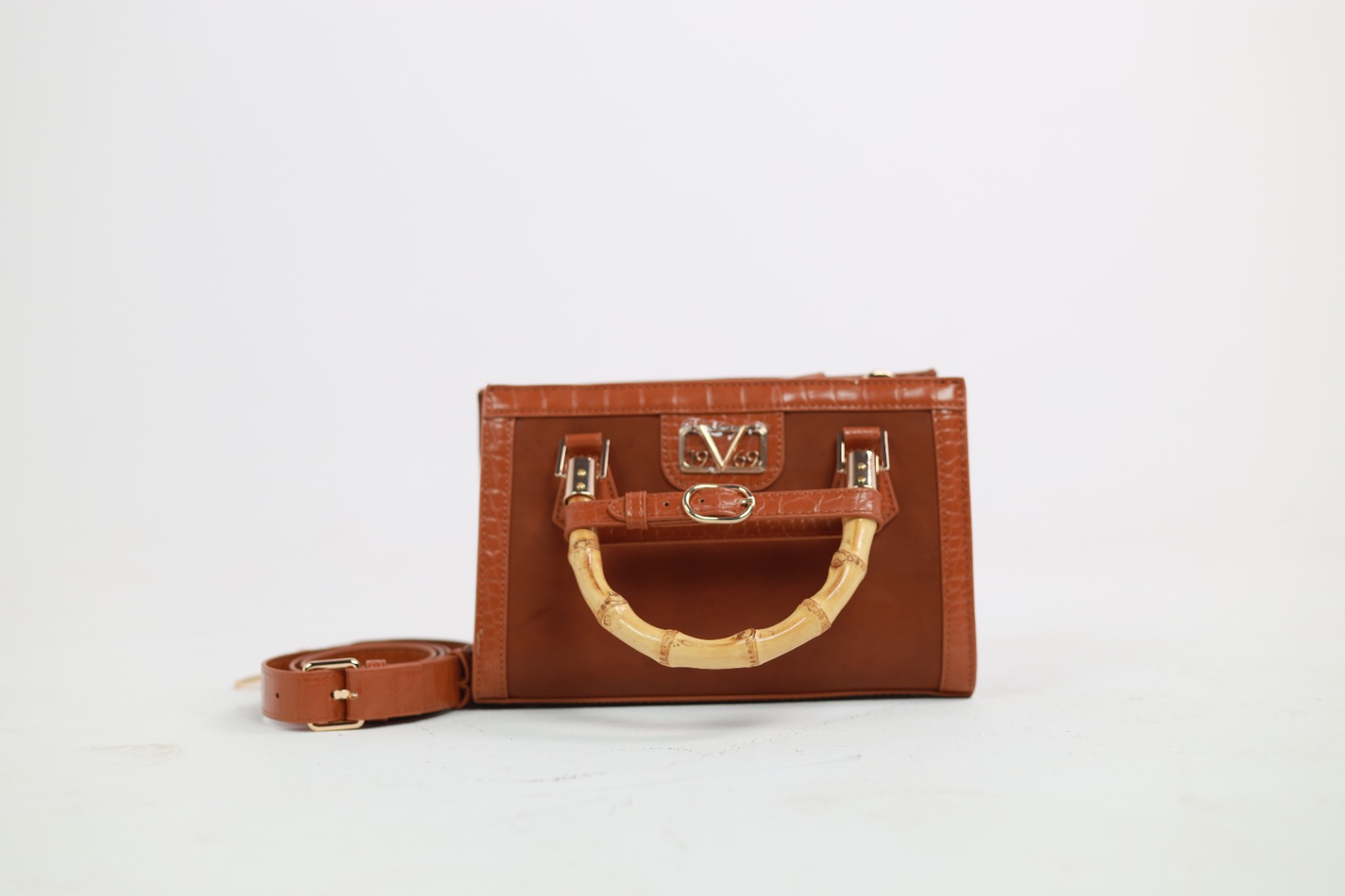 Découvrez l'élégance intemporelle du sac "Yoko" de 19V69 Italia. Confectionné avec un riche similicuir couleur cognac, ce modèle structuré se distingue par ses finitions raffinées à effet crocodile.