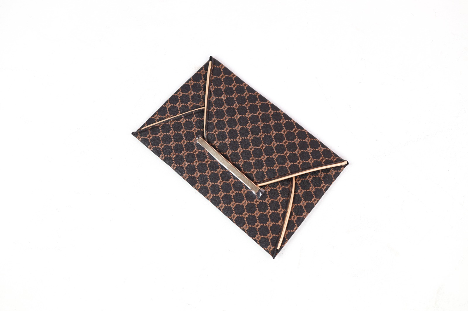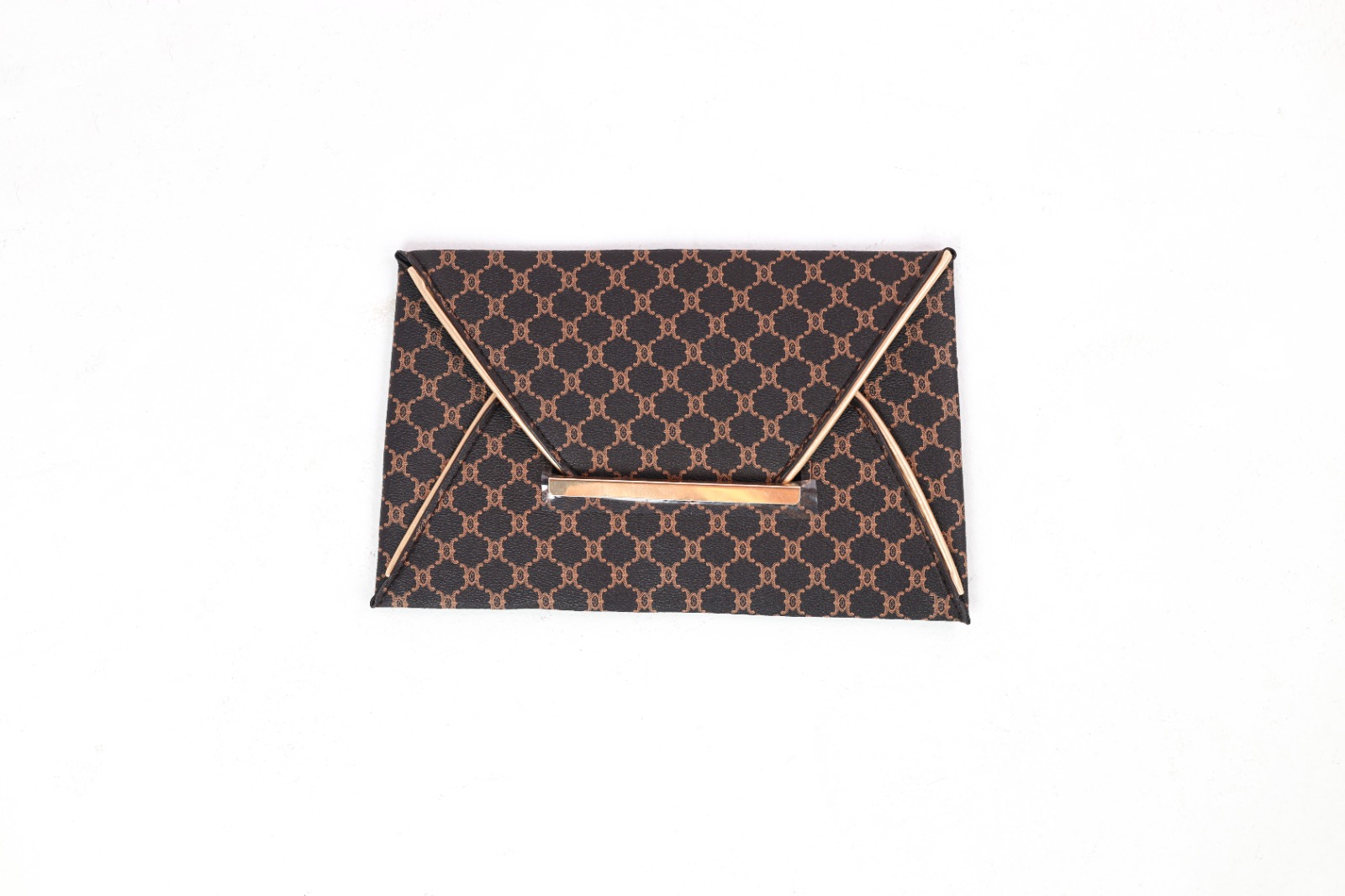 Cette pochette de soirée au style moderne a un motif noir et marron discret et une barre métallique dorée.