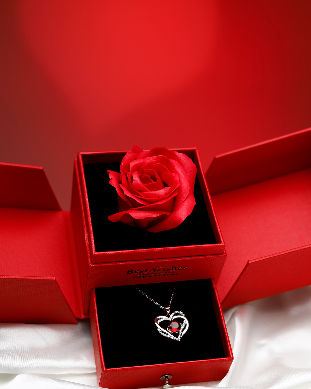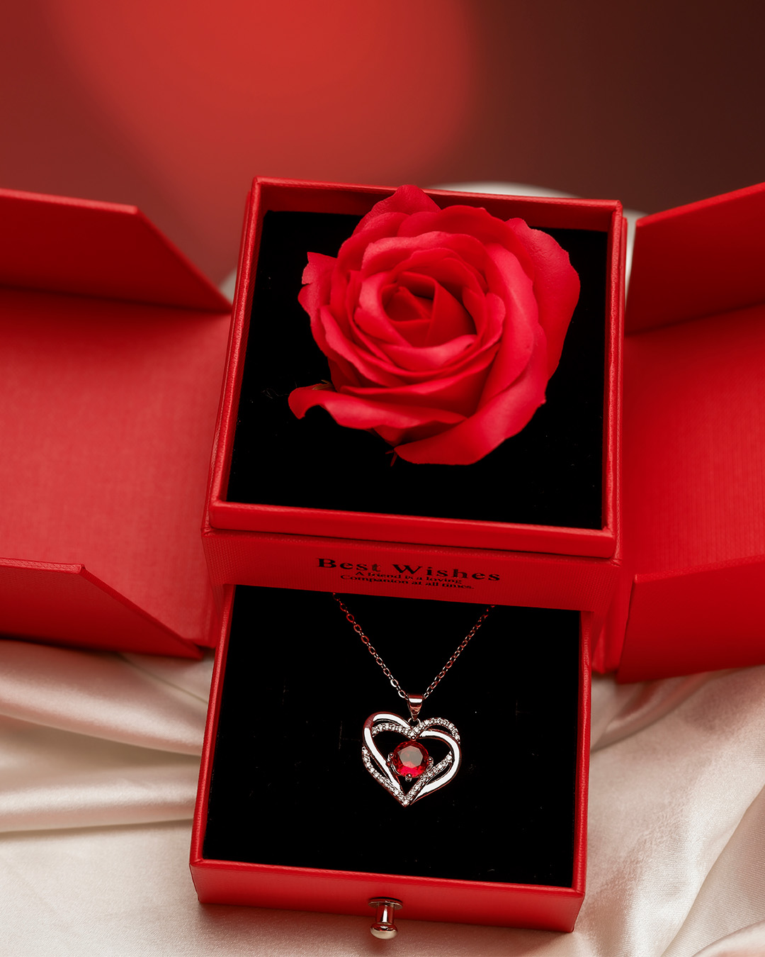 Un coffret élégant qui réunit une rose rouge et un collier cœur scintillant.