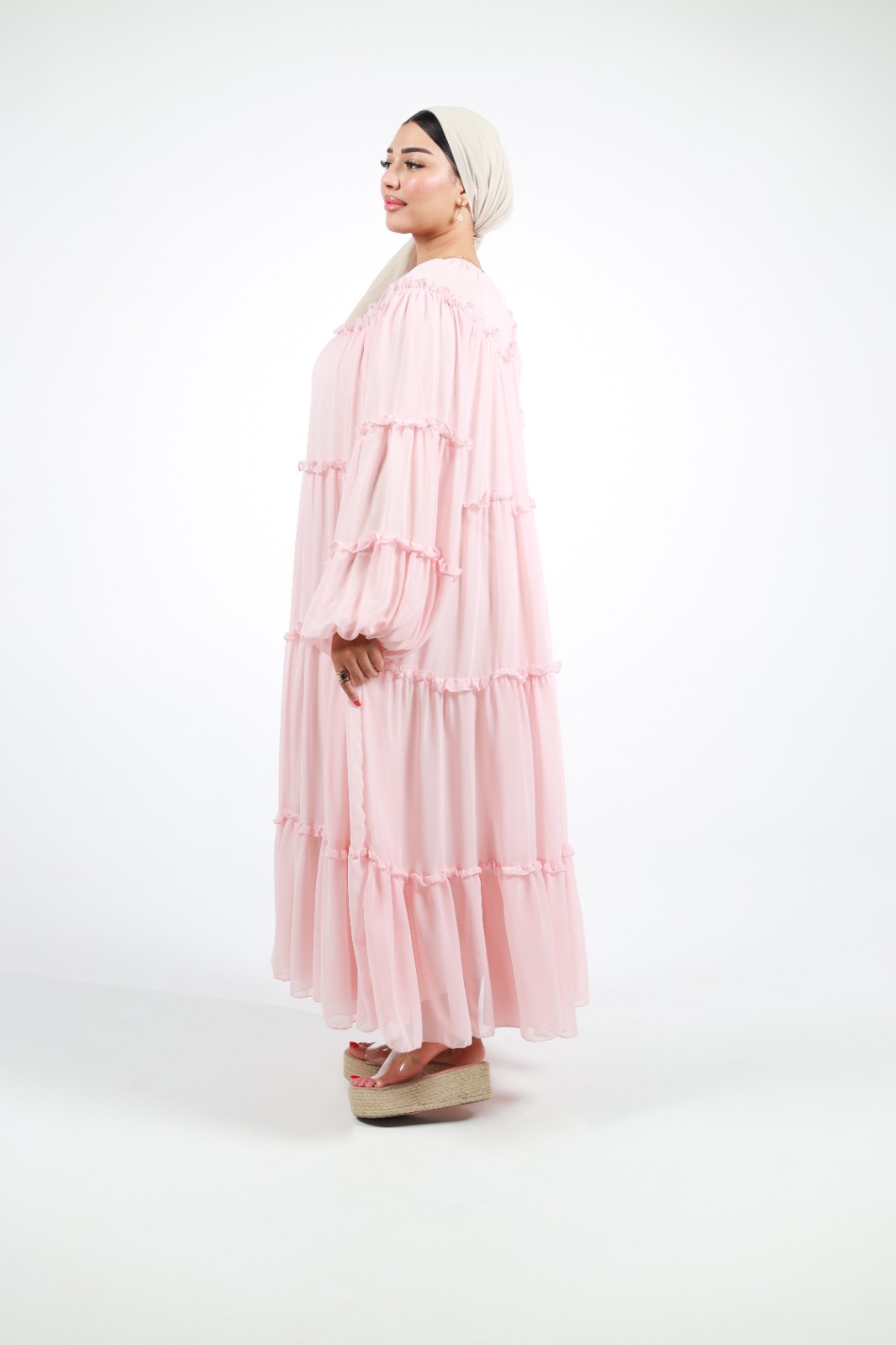 Craquez pour cette robe longue au design fluide et féminin. Avec son tissu léger, ses manches bouffantes et ses détails volantés, elle offre un style élégant et confortable à la fois.