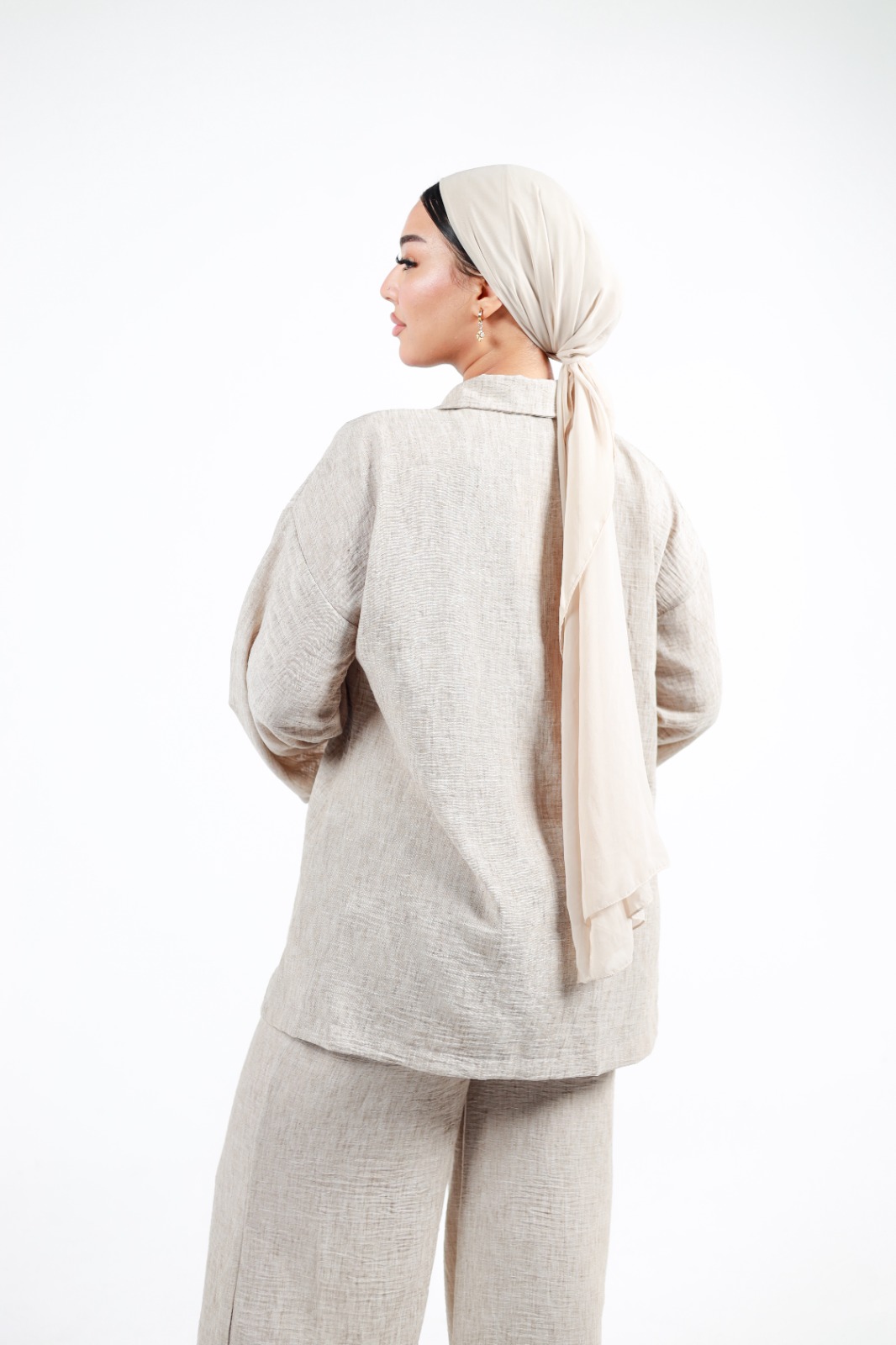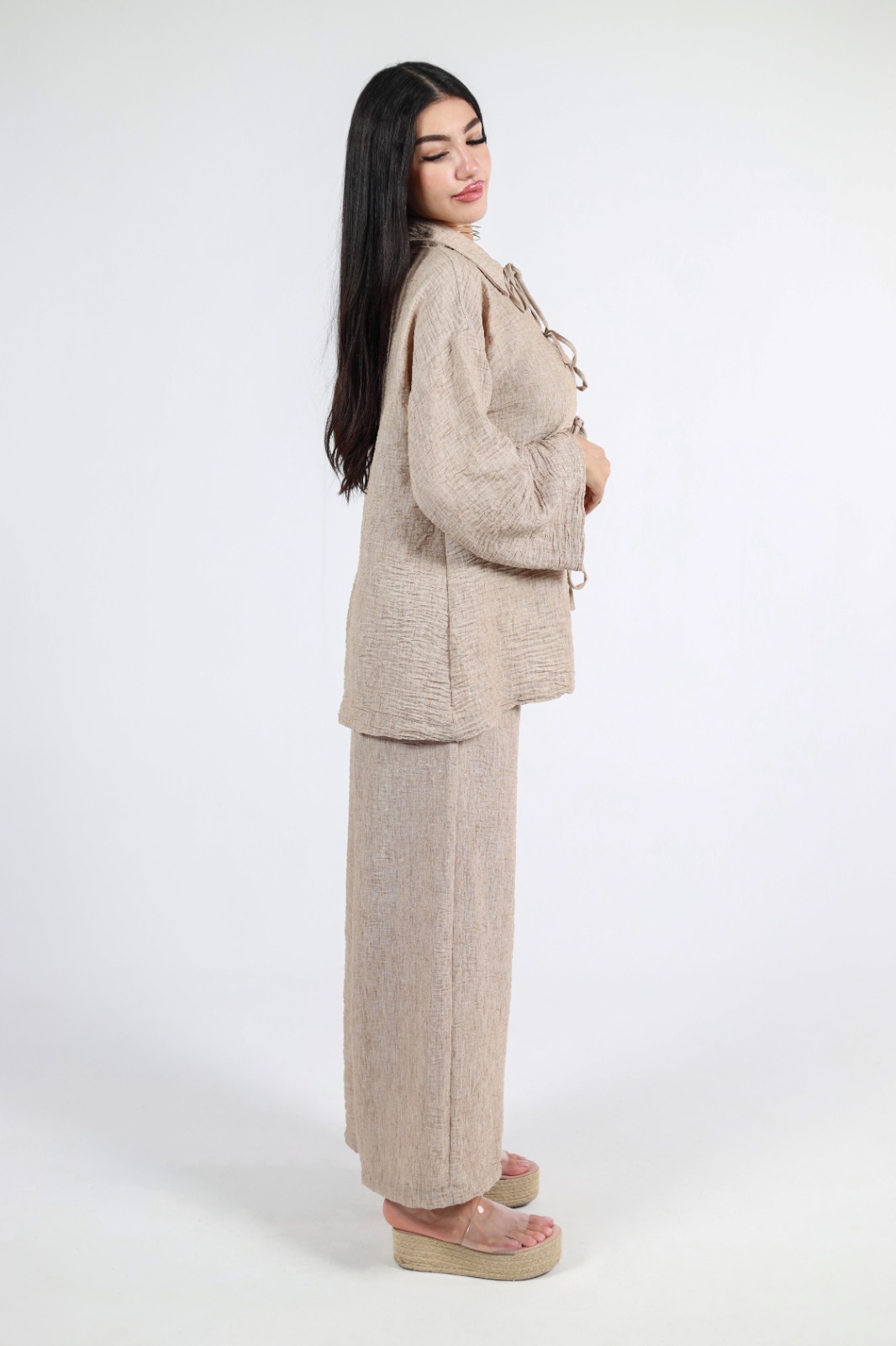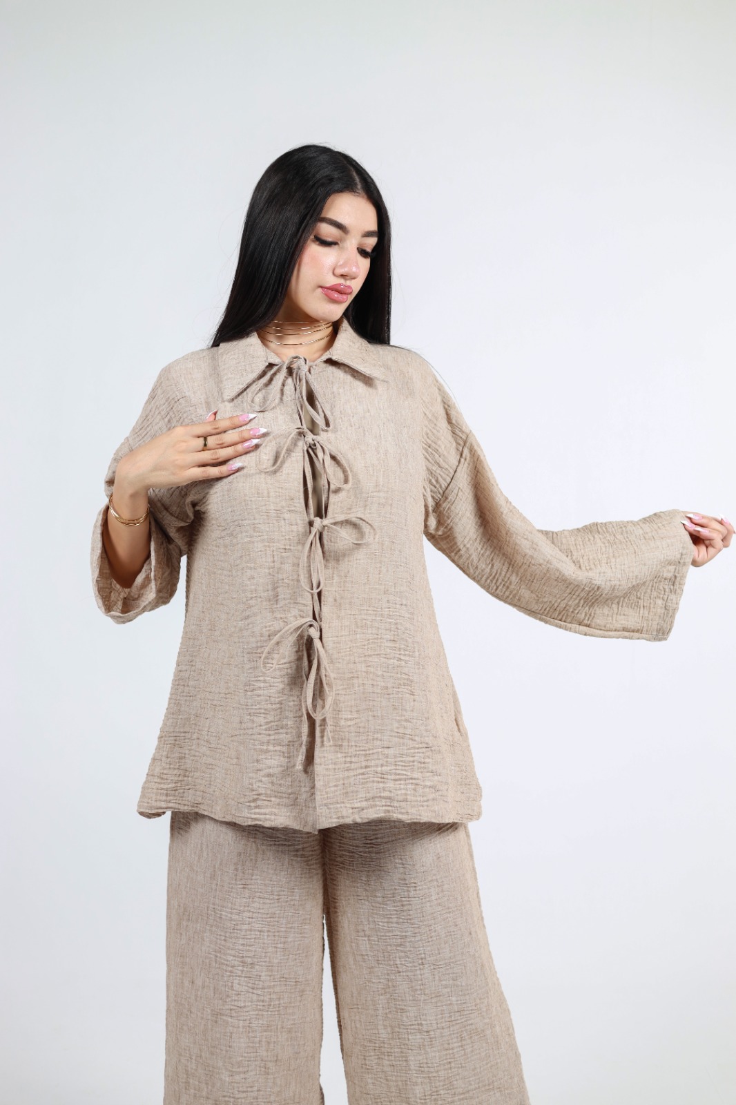 Un ensemble deux pièces élégant et confortable, parfait pour un look simple et moderne. Composé d’un haut fluide à manches larges et d’un pantalon ample assorti, il offre liberté de mouvement et style au quotidien.